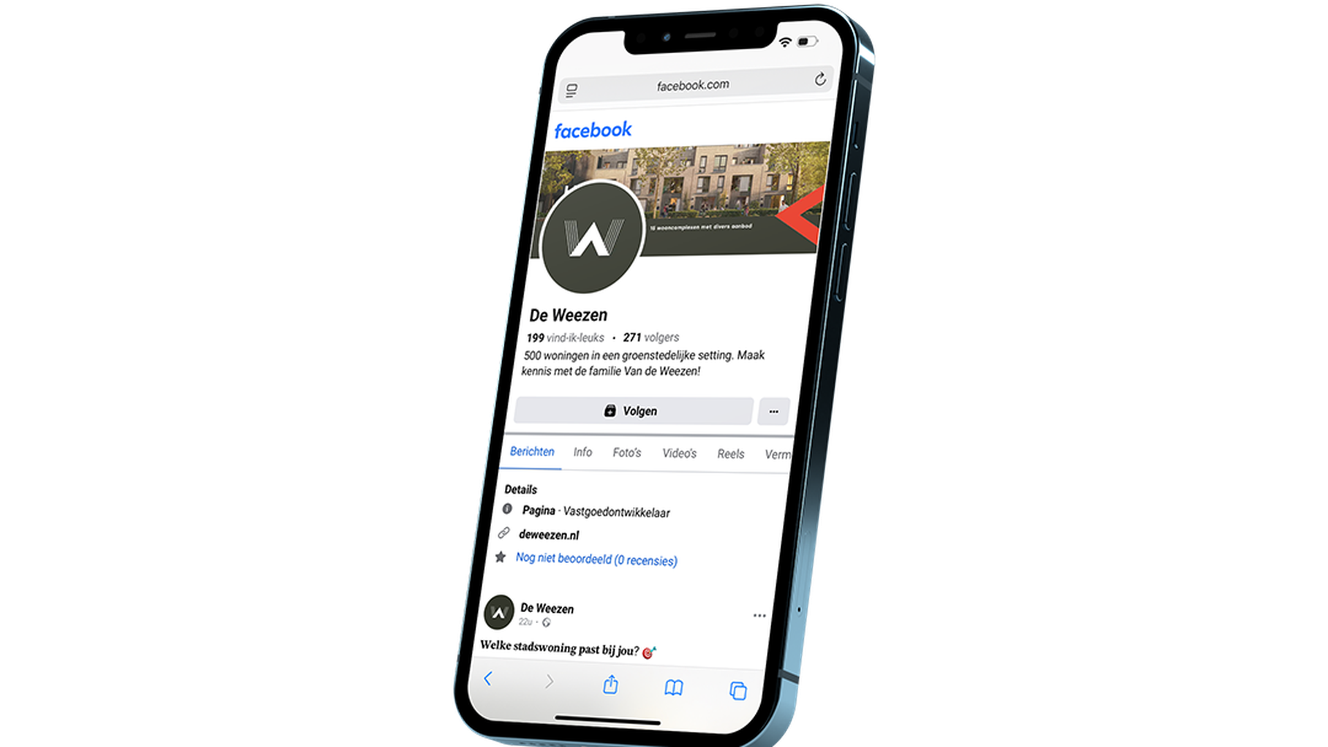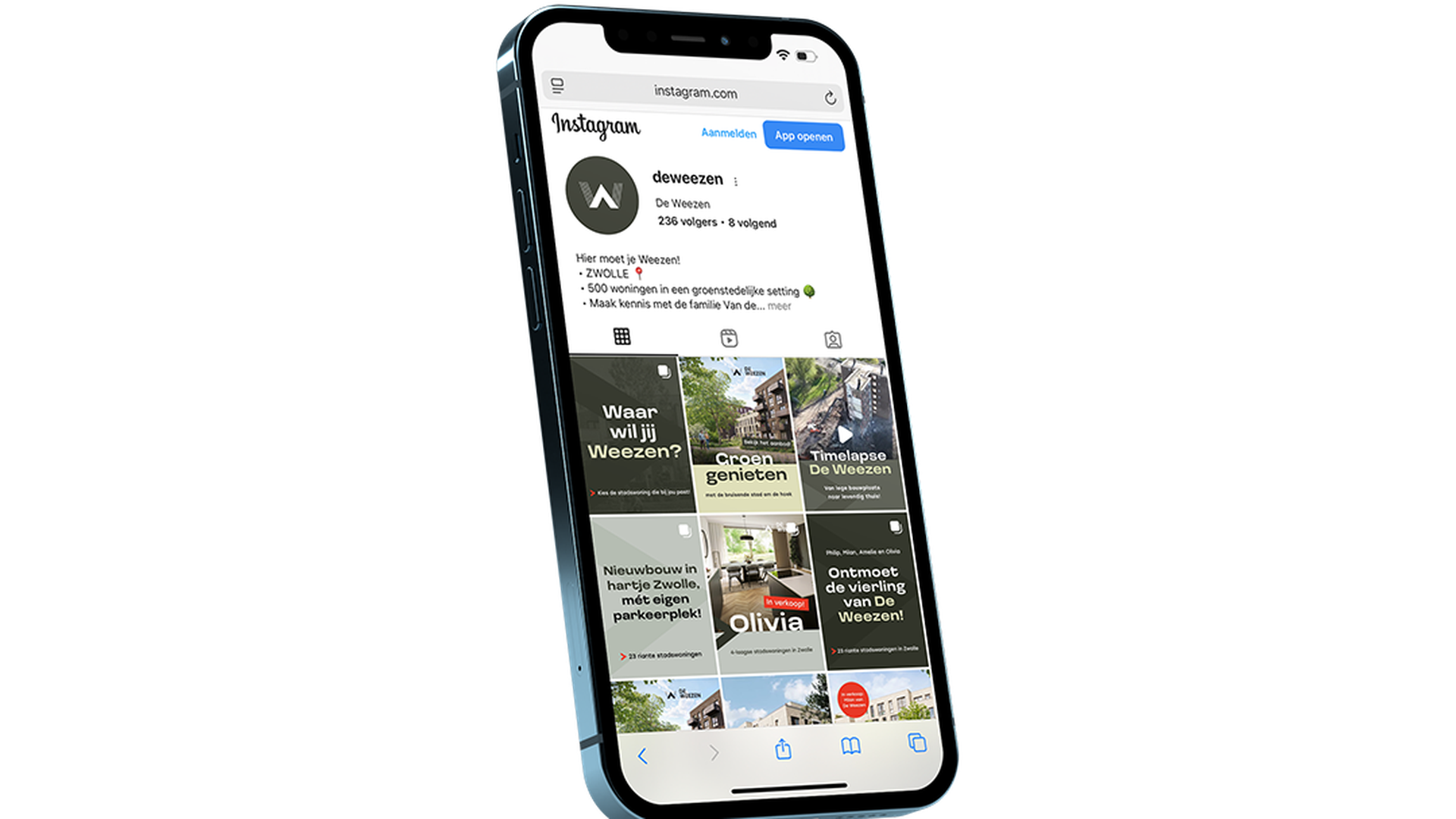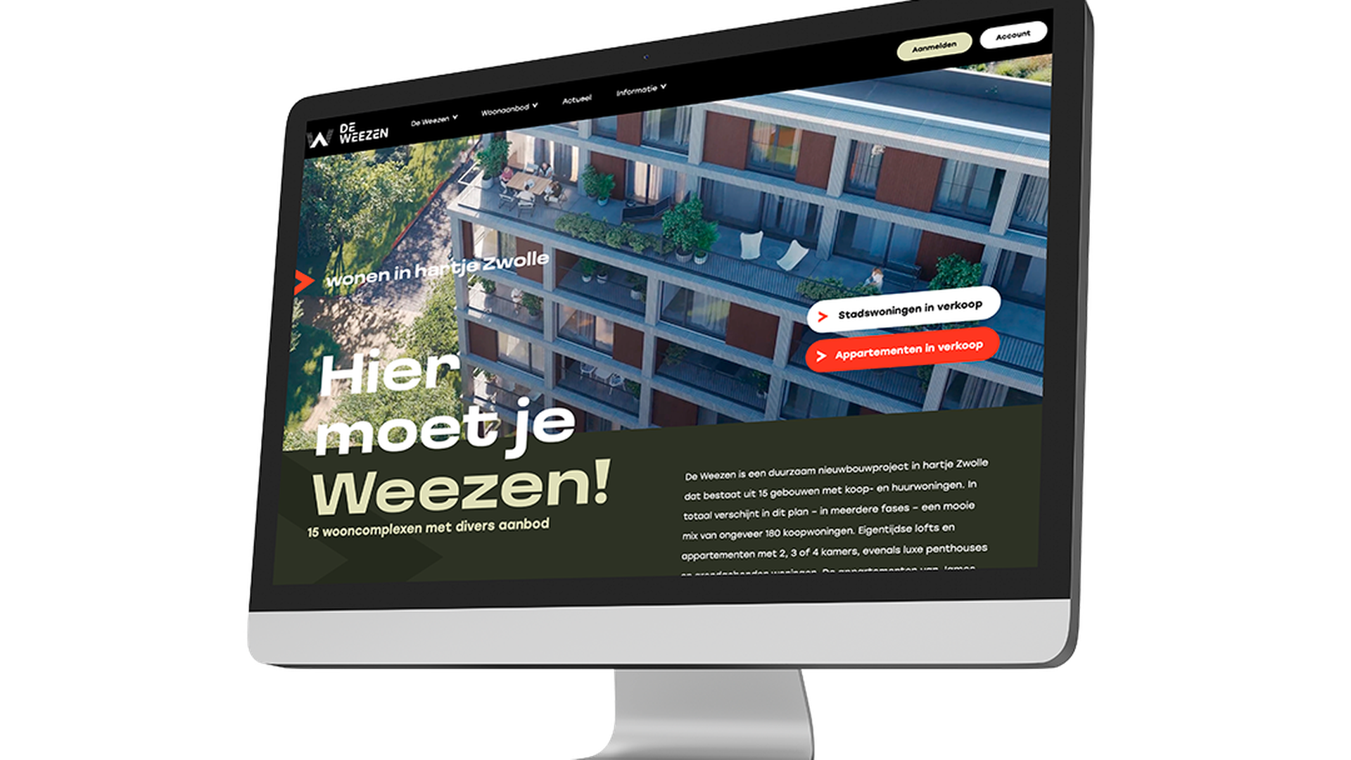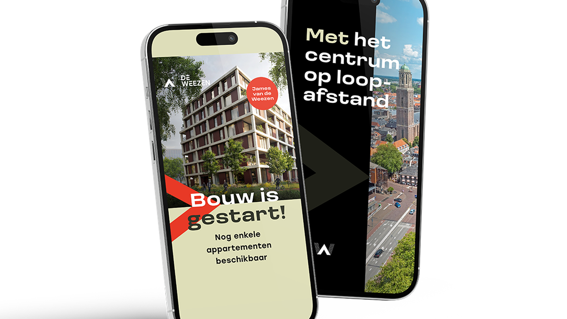 De Weezen is een groenstedelijk nieuwbouwproject aan de rand van de stadsgracht van Zwolle: een toplocatie waar je zó de binnenstad in rolt. De gebiedspromotie had het project goed op de kaart gezet, maar bij de start van de verkoopfase ontstond een nieuwe vraag: hoe kunnen we de productpromotie aanscherpen en effectiever maken? Nijhuis Bouw schakelde ons in om de bestaande middelen te optimaliseren én nieuwe campagnes te ontwikkelen die echt aanzetten tot actie.