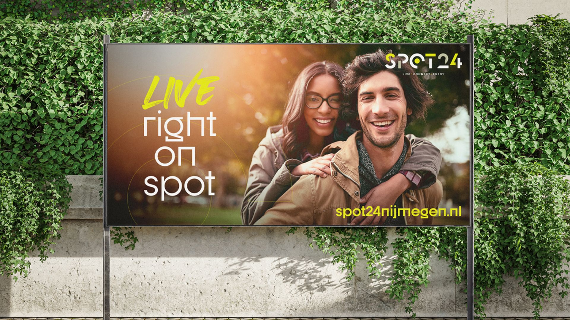 In SPOT24 woon je ‘right on spot’. De plek is een heuse ‘hotspot’ met een open karakter. Een gebied dat draait om de verbinding en levendigheid in het glooiende groen. De eigentijdse naam verwijst bovendien naar het kengetal van Nijmegen met een knipoog naar de genummerde straten in de wijk. De pay-off “Live ∙ Connect ∙Enjoy” zegt alles over het wonen op deze nieuwe spot. Deze woonbeleving zie je ook terug in het logo. En we vertaalden dit naar de juiste beelden en aansprekende teksten die we in de projectwebsite goten. De door ons geleverde diensten voor de totale gebiedspromotie op een rij:
