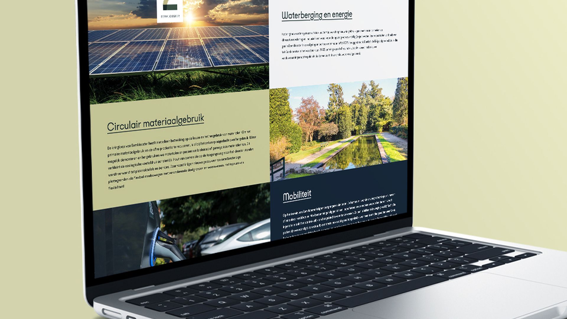 Neem alle ruimte om het thema duurzaamheid toe te lichten in je communicatie. Het is tenslotte één van de belangrijke pijlers van je project en je wilt je publiek zo volledig mogelijk informeren over dit onderwerp. In de basis doe je dit uiteraard met rake copy in de juiste tone of voice. Door tekst af te wisselen met beeldelementen houd je het verhaal luchtig en toegankelijk voor de lezer.