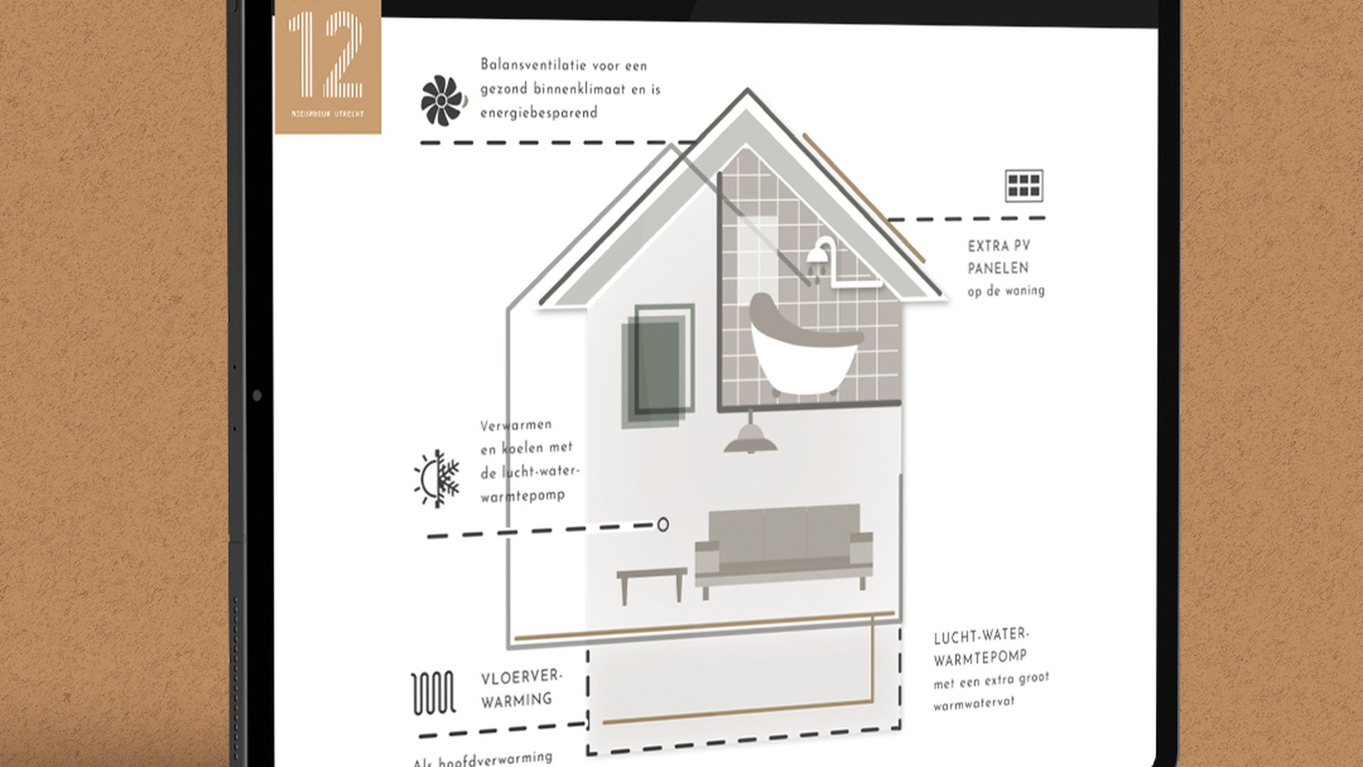 Je kunt nog zoveel vertellen, maar wil je de consument echt enthousiast maken voor een duurzame woning? Vergeet dan niet om jouw verhaal te illustreren. Bijvoorbeeld met een dwarsdoorsnede van een dergelijke woning. Zo is in één oogopslag duidelijk waar die duurzaamheid uit bestaat. Je laat de warmtepomp en balansventilatie zien, het groene dak voor de opvang van regenwater en de eigen thuisbatterij. Een impressie als deze maken wij graag voor je op. Net als een infographic of animatie die meteen ook het gebruikersgemak van installaties inzichtelijk maakt. Zo worden de voordelen van duurzaam wonen ineens heel concreet.